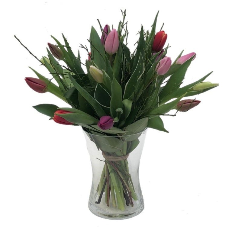 Haal het voorjaar in huis met een gezellig boeket met tulpen, kant en klaar in een vaas.