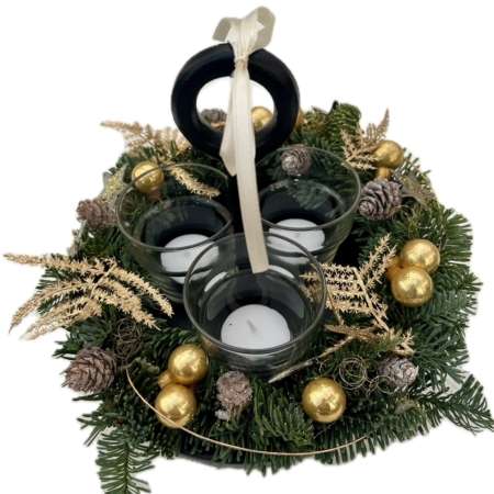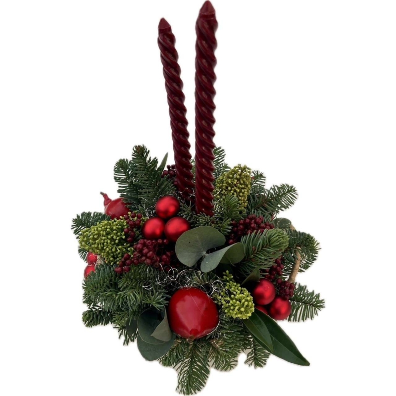 Kerstarrangement Bobbi is een arrangement in warme traditionele kleuren. Het stuk is rijk opgemaakt met dennengroen, glazen rode kerstballen, sierlijke bessen en andere natuurlijke materialen. De twee gedraaide kaarsen maken het tot een feestelijk arrangement.