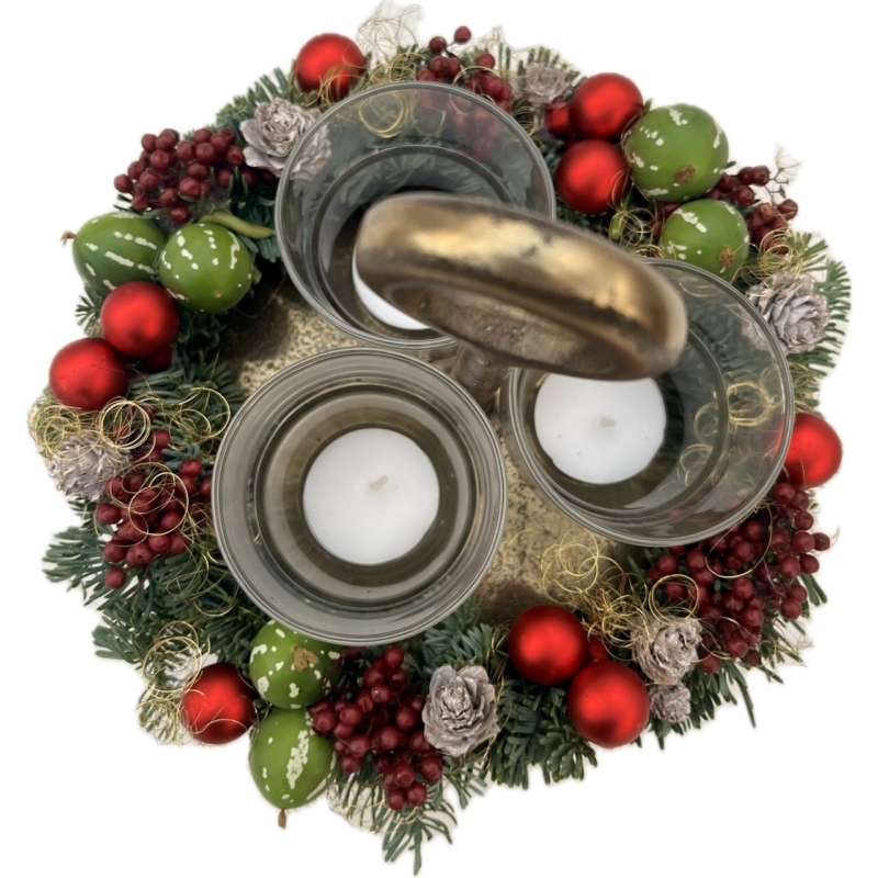 Kerstarrangement Nouri is een feestelijke arrangement in de rode kleuren op een goud kleurige etagère. Perfect als tafeldecoratie, cadeautje of een sfeervol pronkstuk in de woonkamer.