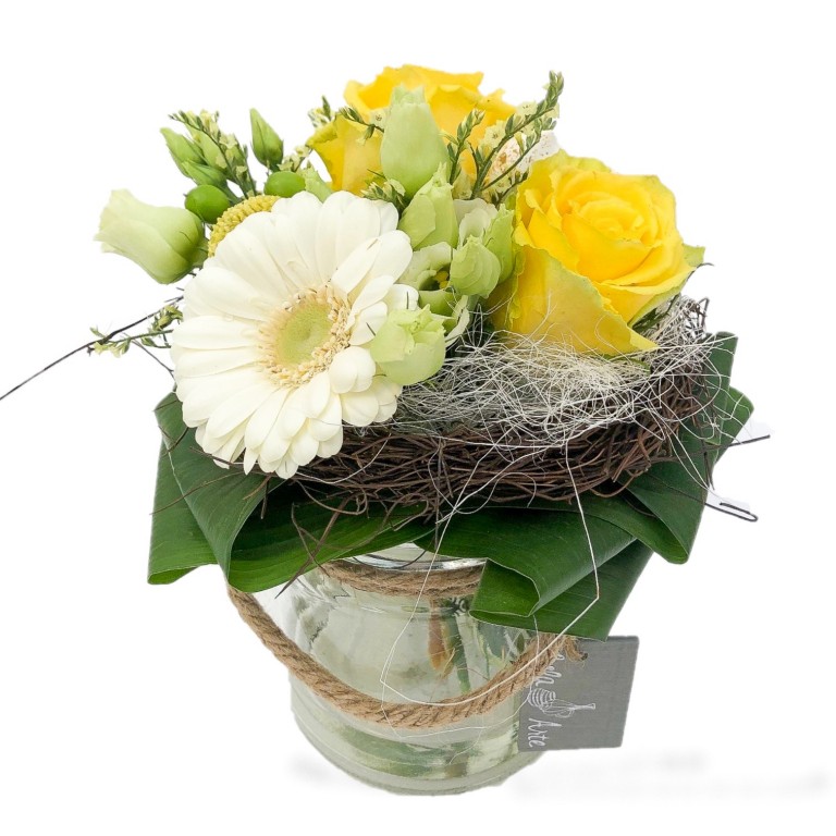 Een lief paasboeketje in geel en witte kleuren. Dit vogelnestje met voorjaarsbloemen maakt je paastafel helemaal af maar is ook zeker erg leuk om weg te geven.