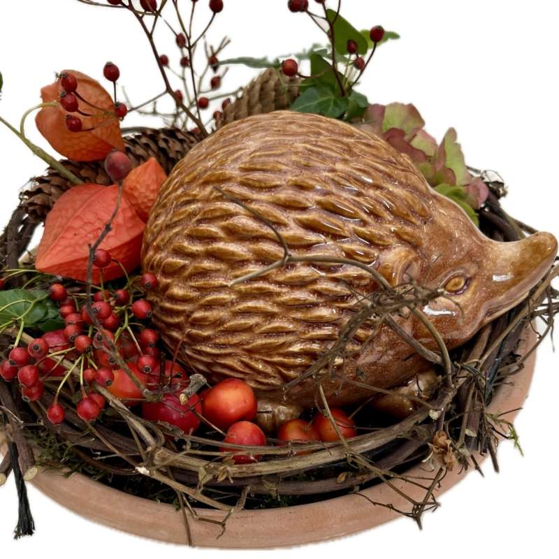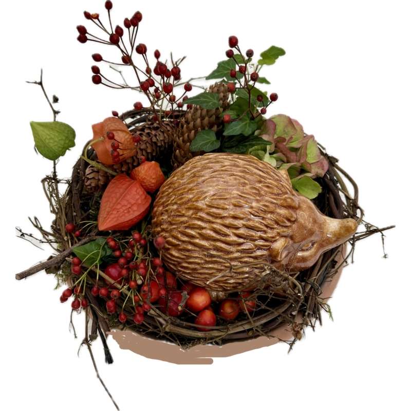Plantenarrangement Nasia is een seizoensarrangement bestaand uit hortensia, bessen, hedera en diverse vruchten. Het geheel wordt afgemaakt door een decoratief egeltje