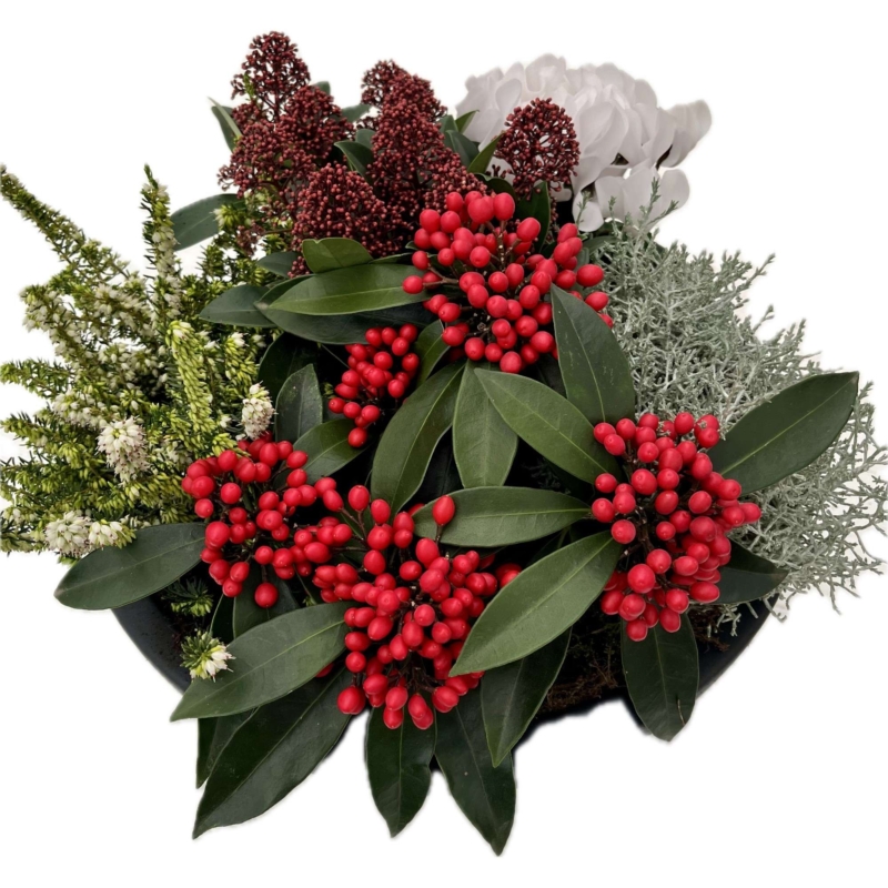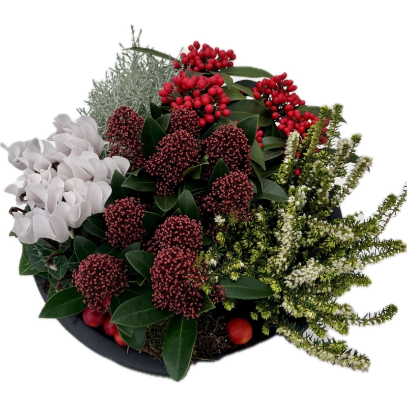 Winterse schaal met witte cyclaam en rode bessen. Sfeervolle winterdecoratie in een stijlvolle schaal met witte cyclaam, skimmia, rode bessen en zilverkleurig siergroen. Perfect als natuurlijke blikvanger op een tafel of bij de voordeur